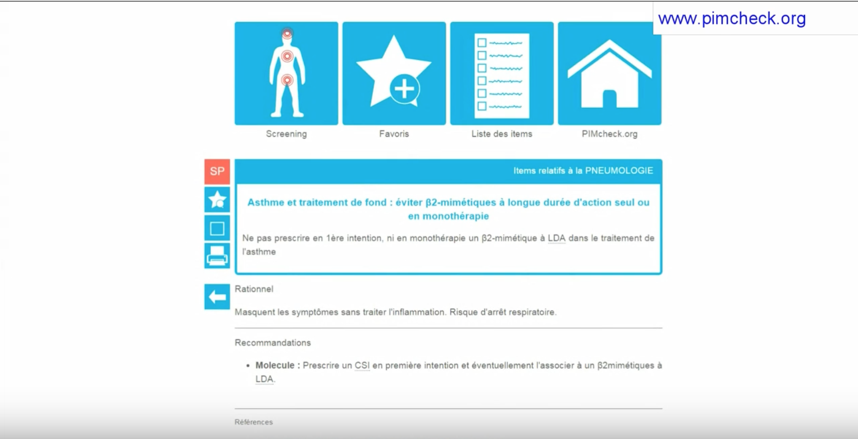 PIM-check se présente sous la forme d’un outil interactif en français et en anglais. Il contient les 160 items validés par le panel d’experts : 74 relatifs à des sous-prescriptions, 36 à des sur-prescriptions, 16 à des interactions médicamenteuses et 34 à des réévaluations de traitement ou bon usage du médicament. Ils sont regroupés par spécialités médicales et pathologies.